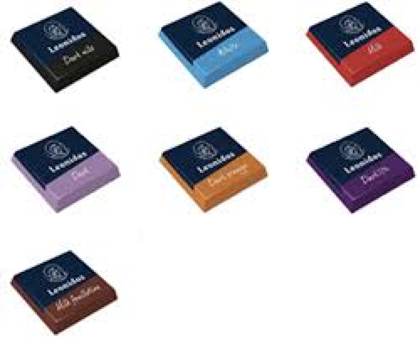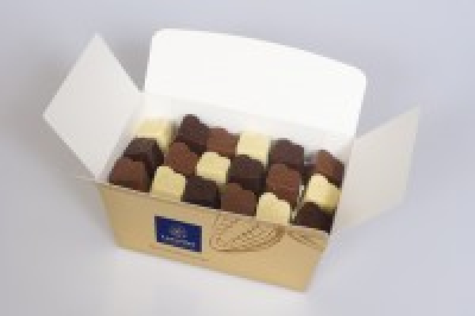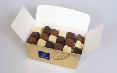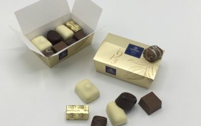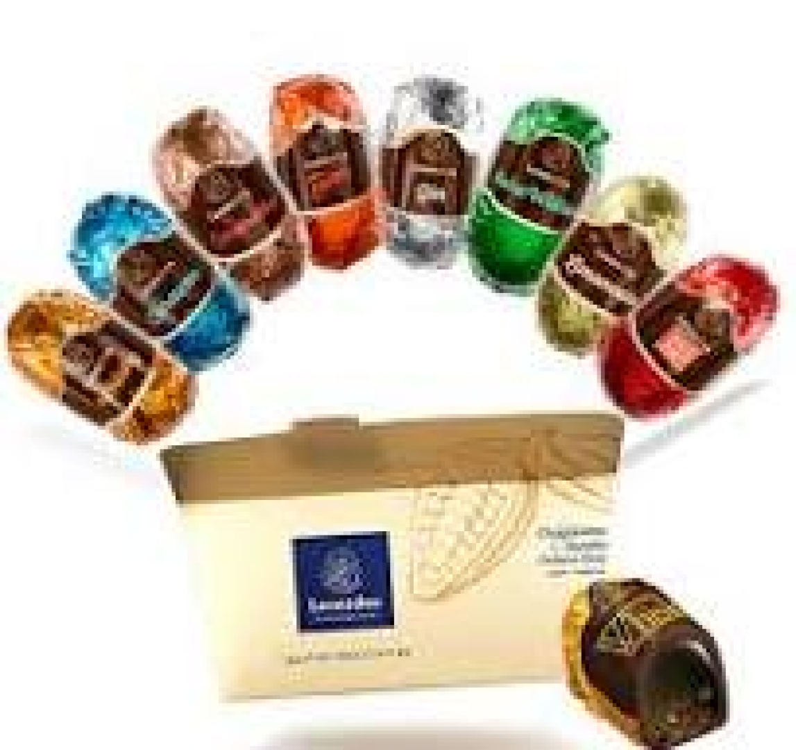 Melk met vanille - wit met praliné - fondant met ganache van pure chocolade - wit met kersen en vlierbessenganache - wit met bloedsinaasappelganache - wit met frambozenganache