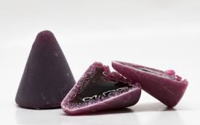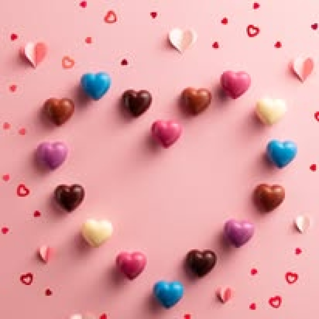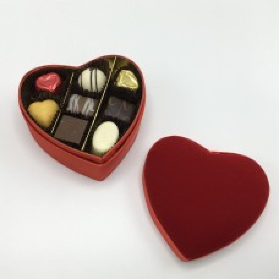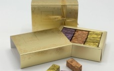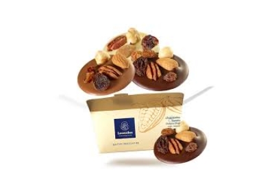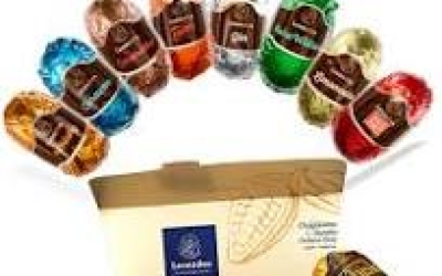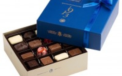 Melk met vanille - wit met praliné - fondant met ganache van pure chocolade - wit met kersen en vlierbessenganache - wit met bloedsinaasappelganache - wit met frambozenganache